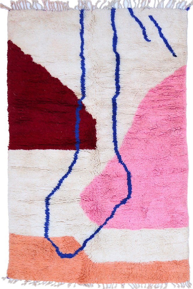 Proviene de una tribu de la región rocosa y alta de Azilal, que se encuentra en las montañas del Alto Atlas. Esta alfombra bereber roja tiene muchos motivos abstractos con varios símbolos bereberes. Esta alfombra, ya sea de pelo largo o corto, destaca por el color, a menudo sobre un fondo beige, blanco o crema. Puedes encontrar modelos que destacan el color rojo con patrones geométricos que simbolizan la fertilidad, la protección, la naturaleza, la suerte o el hogar.(los motivos serán principalmente rombos, se encuentran menos alfombras bereberes de lunares para la tribu Azilal). Estos modelos de alfombras marroquíes suelen estar asociados aalfombras bereberes fluorescentesPor su mezcla de colores vivos y brillantes.