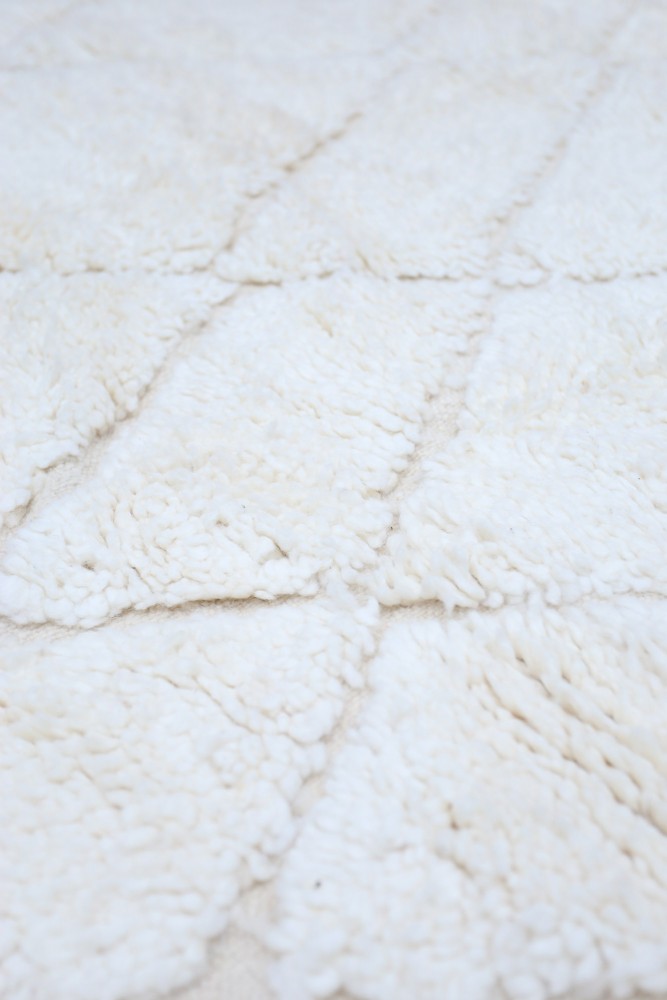 La alfombra Beni Ouarain es uno de los estilos de alfombras bereberes más populares en la actualidad. Generalmente tiene rombos blancos y negros, con motivos minimalistas que atraen a los amantes de la decoración moderna. Se adapta a todos los estilos contemporáneos aportando mucha suavidad. Esta alfombra bereber blanca y negra tiene un diseño muy puro, con líneas simples y colores claros realzados por líneas negras. Así obtienes un efecto gráfico representativo de la alfombra bereber con diseño de rombos.