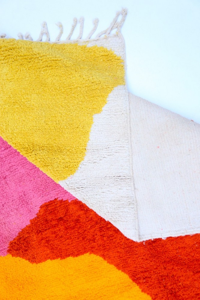 Esta alfombra bereber llamada Azilal recibe su nombre de la región de Azilal en Marruecos, donde fue hecha a mano en un telar tradicional de madera. Sus diseños representan los estados de ánimo, amores y penas de la tejedora en el momento de su creación. Una vez que esta alfombra bereber de colores es creada, ella hará otra completamente diferente, dependiendo de sus emociones del momento. Cada pieza es única.