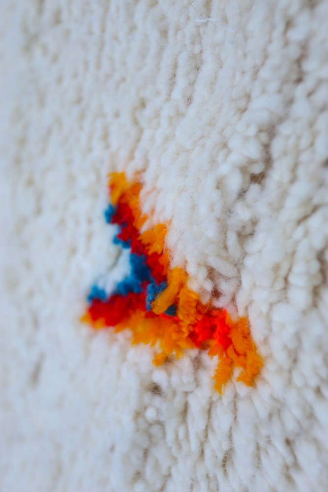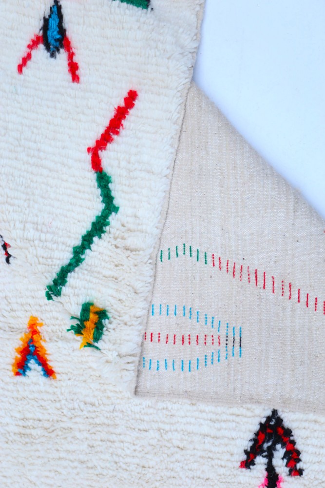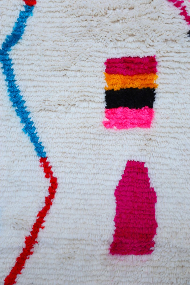 Esta alfombra bereber llamada Azilal recibe su nombre de la región de Azilal en Marruecos, donde ha sido confeccionada a mano en un telar tradicional de madera. Sus diseños representan los sentimientos, amores y penas de la tejedora en el momento de su creación. Una vez que se ha creado esta alfombra bereber colorida, ella creará otra totalmente diferente, según sus emociones del momento. Cada pieza es única.