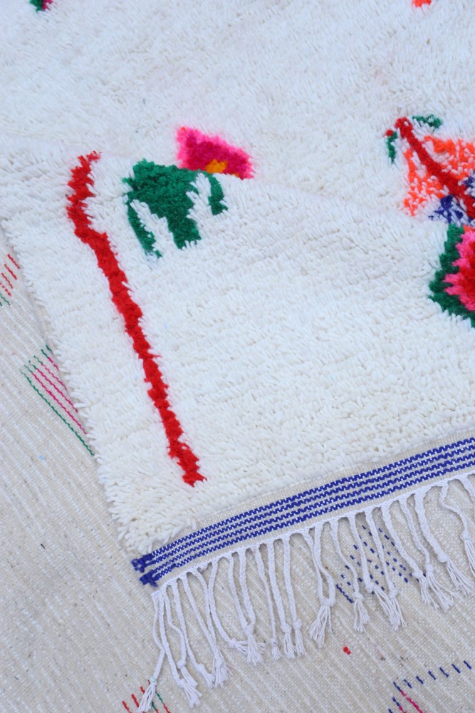 Nuestras alfombras con fondo blanco y diseños coloridos siempre tienen un fondo blanco de lana. Los colores pueden ser de algodón o lana. Los colores muy vivos suelen ser de algodón y los colores más naturales son de lana. Nuestras alfombras totalmente coloridas son 100% de lana.