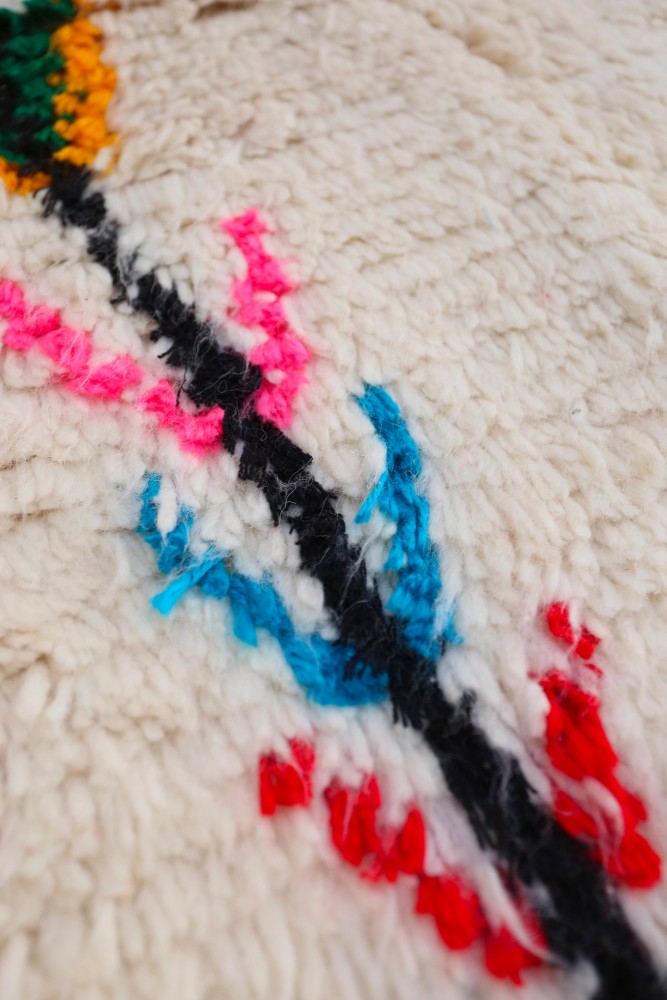 Esta alfombra bereber llamada Azilal recibe su nombre de la región de Azilal en Marruecos, donde ha sido confeccionada a mano en un telar tradicional de madera. Sus diseños representan los estados de ánimo, amores y penas de la tejedora en el momento de su creación. Una vez que se ha creado esta alfombra bereber de colores, ella creará otra totalmente diferente, dependiendo de sus emociones en ese momento. Cada pieza es única.