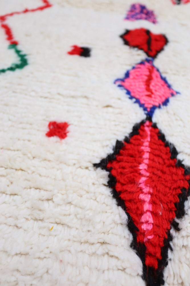 Esta alfombra bereber llamada Azilal recibe su nombre de la región de Azilal en Marruecos, donde ha sido confeccionada a mano en un telar tradicional de madera. Sus diseños representan los estados de ánimo, amores y penas de la tejedora en el momento de su creación. Una vez que se ha creado esta alfombra bereber de colores, ella creará otra totalmente diferente, dependiendo de sus emociones en ese momento. Cada pieza es única.