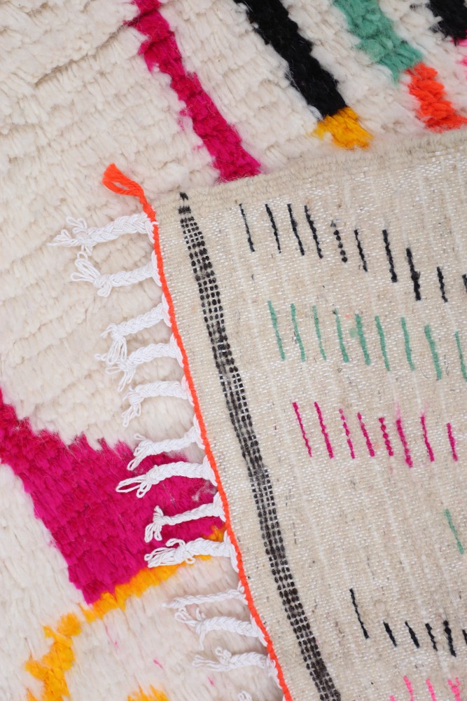 Esta alfombra bereber llamada Azilal recibe su nombre de la región de Azilal en Marruecos, donde ha sido confeccionada a mano en un telar tradicional de madera. Sus diseños representan los estados de ánimo, amores y penas de la tejedora en el momento de su creación. Una vez que se ha creado esta alfombra bereber de colores, ella creará otra totalmente diferente, dependiendo de sus emociones en ese momento. Cada pieza es única.