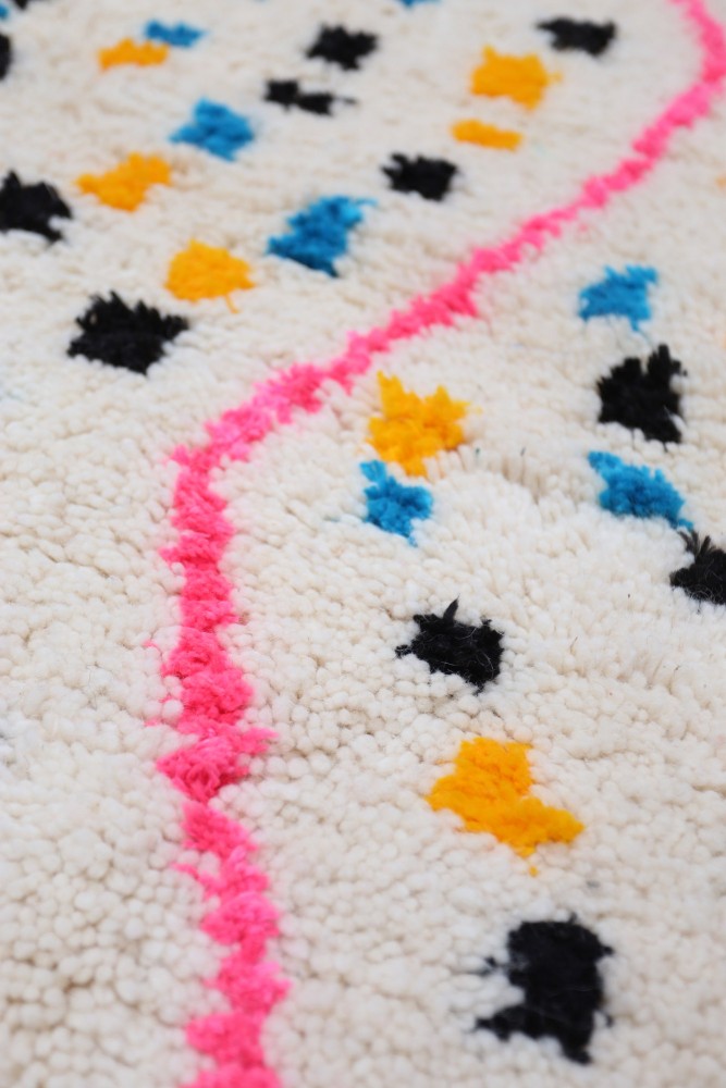 Esta alfombra bereber llamada Azilal recibe su nombre de la región de Azilal en Marruecos, donde ha sido confeccionada a mano en un telar tradicional de madera. Sus diseños representan los estados de ánimo, amores y penas de la tejedora en el momento de su creación. Una vez que se ha creado esta alfombra bereber de colores, ella creará otra totalmente diferente, dependiendo de sus emociones en ese momento. Cada pieza es única.