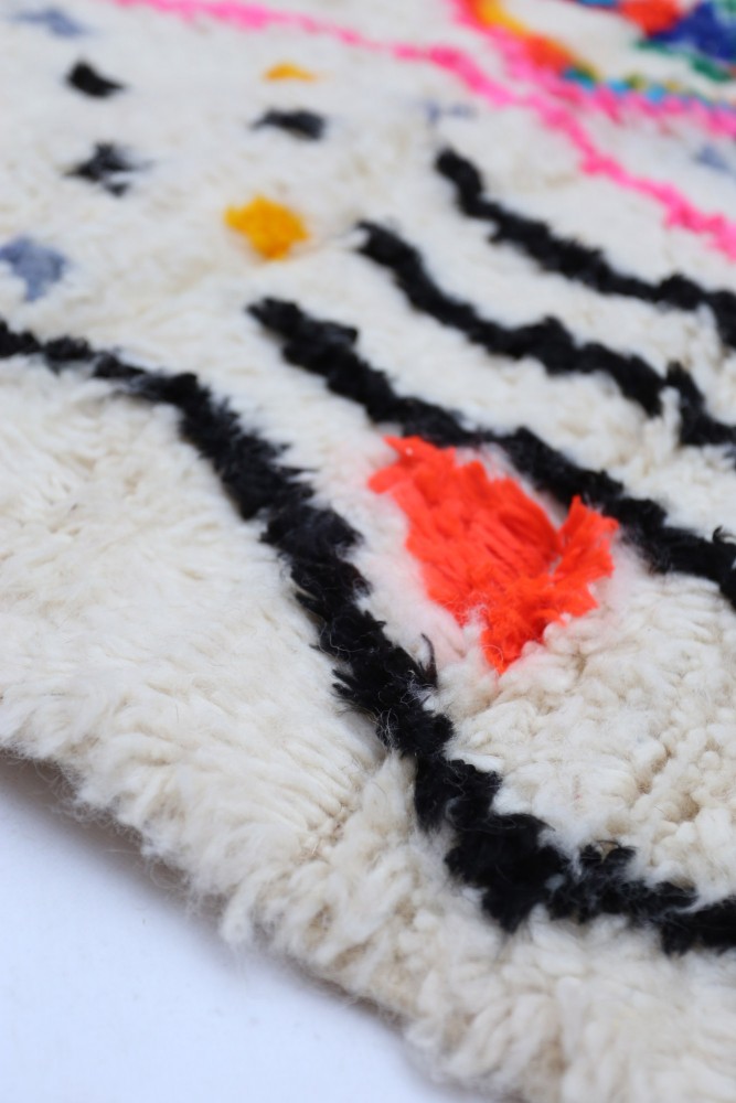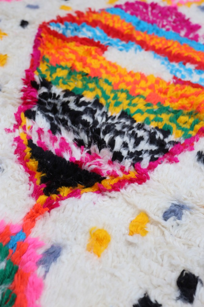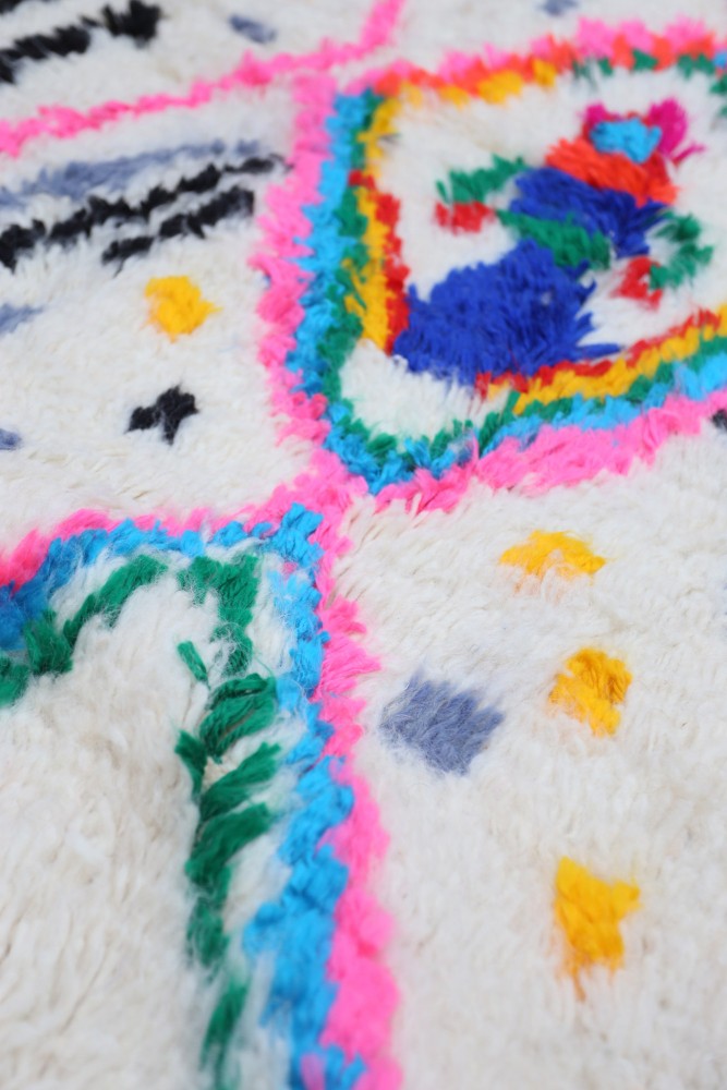 Esta alfombra bereber llamada Azilal recibe su nombre de la región de Azilal en Marruecos, donde ha sido confeccionada a mano en un telar tradicional de madera. Sus diseños representan los estados de ánimo, amores y penas de la tejedora en el momento de su creación. Una vez que se ha creado esta alfombra bereber de colores, ella creará otra totalmente diferente, dependiendo de sus emociones en ese momento. Cada pieza es única.