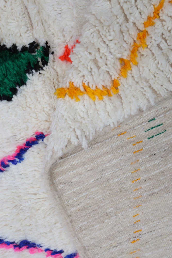 Esta alfombra bereber llamada Azilal recibe su nombre de la región de Azilal en Marruecos, donde ha sido confeccionada a mano en un telar tradicional de madera. Sus diseños representan los estados de ánimo, amores y penas de la tejedora en el momento de su creación. Una vez que se ha creado esta alfombra bereber de colores, ella creará otra totalmente diferente, dependiendo de sus emociones en ese momento. Cada pieza es única.