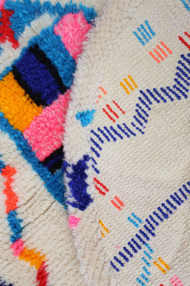 Esta alfombra bereber llamada Azilal recibe su nombre de la región de Azilal en Marruecos donde se ha confeccionado a mano en un telar tradicional de madera. Sus diseños representan los estados de ánimo, amores y penas de la tejedora en el momento de su creación. Una vez hecha esta alfombra bereber de colores, ella creará otra totalmente diferente, según sus emociones del momento. Cada pieza es única. Esta alfombra bereber representa más de un mes de tejido. Descubre en vídeo cómo se crean las alfombras bereberes THEM haciendo clic aquí. Nuestras alfombras con fondo blanco y diseños coloridos siempre tienen un fondo blanco de lana. Los colores pueden ser de algodón o lana. Los colores muy vibrantes suelen ser de algodón y los que tienen un aspecto más natural son de lana. Nuestras alfombras totalmente coloridas son 100% de lana. ENVÍO Todos los paquetes se envían desde Francia. No se esperan cargos de aduana para pedidos realizados en un país de la Unión Europea. Para pedidos realizados en un país fuera de la UE, podrían aplicarse cargos de aduana. Realizamos envíos a todo el mundo y todos los pedidos se envían cada 7 a 15 días. Para Francia: puedes elegir entre una entrega en un punto de recogida con Mondial Relay o una entrega a domicilio con Colissimo. Para el resto del mundo: el costo del envío varía según el país. Simplemente agrega la alfombra al carrito, introduce tu dirección y se te mostrará el costo exacto del envío. DEVOLUCIÓN Tienes un plazo de 14 días a partir de la entrega de tu paquete para solicitar un cambio, un vale o un reembolso. Para Francia: - Si deseas un cambio/vale: todo es gratuito (el retorno y la entrega del nuevo paquete corren a nuestro cargo) - Si deseas un reembolso: el retorno corre por tu cuenta Para el resto del mundo: - Si deseas un cambio: el retorno del paquete corre por tu cuenta y la entrega del nuevo paquete corre a nuestro cargo - Si deseas un reembolso: el retorno corre por tu cuenta Sorprendentemente, las alfombras bereberes se cuidan fácilmente. Hay que tener en cuenta que estas piezas cargadas de historia no tienen como objetivo principal ser un objeto decorativo. Las mujeres bereberes las tejen y las usan como manta o alfombra para la aislación. La calidad excepcional del tejido permite que las alfombras bereberes se conserven con el tiempo y envejezcan muy bien. Para su cuidado, puedes pasar la aspiradora sobre ella una vez por semana como máximo para no dañar la lana. Si no puedes sacudirla, dale la vuelta durante unas horas una vez al mes, todas las partículas de polvo caerán en profundidad. En caso de mancha, simplemente dale unos golpecitos con un paño húmedo, a menudo es suficiente. De lo contrario, añade vinagre de alcohol o jabón de Marsella con mucha agua.Más información