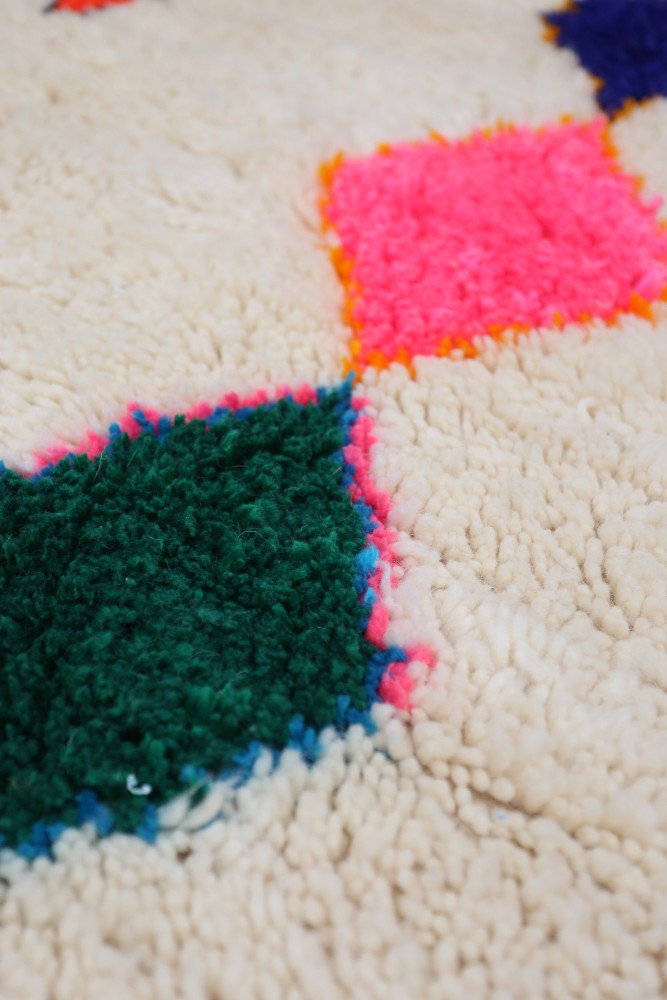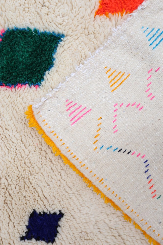 Esta alfombra bereber llamada Azilal recibe su nombre de la región de Azilal en Marruecos, donde ha sido confeccionada a mano en un telar tradicional de madera. Sus diseños representan los estados de ánimo, amores y penas de la tejedora en el momento de su creación. Una vez que se ha creado esta alfombra bereber de colores, ella creará otra totalmente diferente, dependiendo de sus emociones en ese momento. Cada pieza es única.