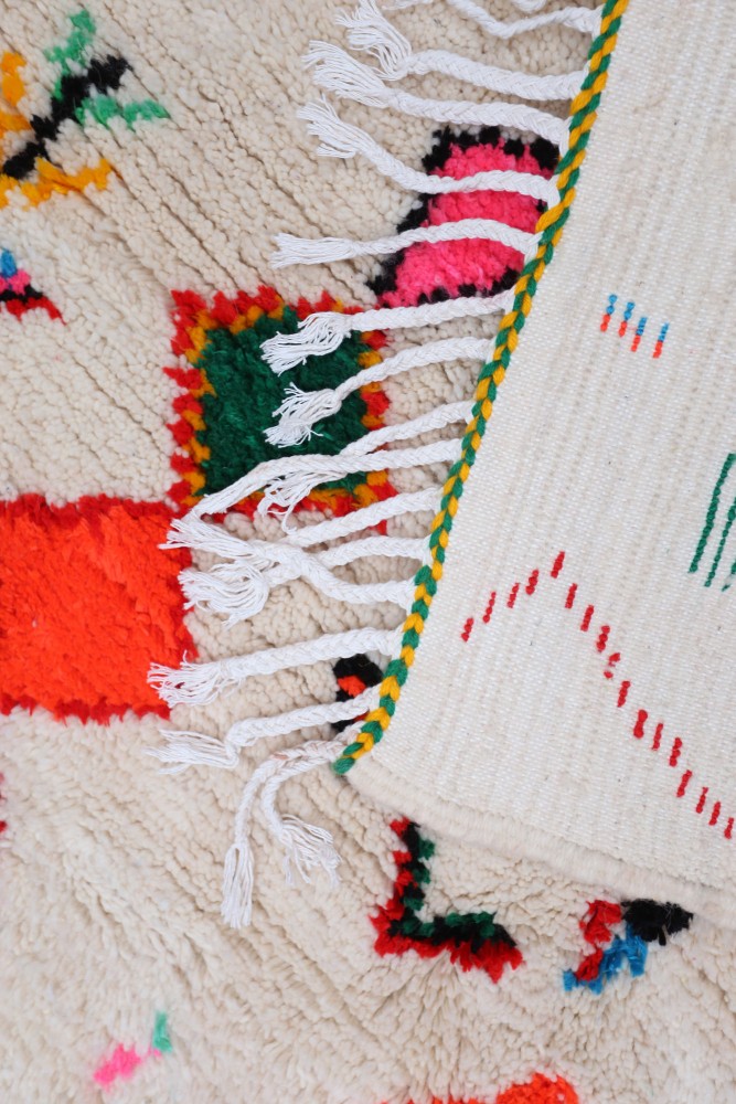 Esta alfombra bereber llamada Azilal recibe su nombre de la región de Azilal en Marruecos, donde ha sido confeccionada a mano en un telar tradicional de madera. Sus diseños representan los estados de ánimo, amores y penas de la tejedora en el momento de su creación. Una vez que se ha creado esta alfombra bereber de colores, ella creará otra totalmente diferente, dependiendo de sus emociones en ese momento. Cada pieza es única.