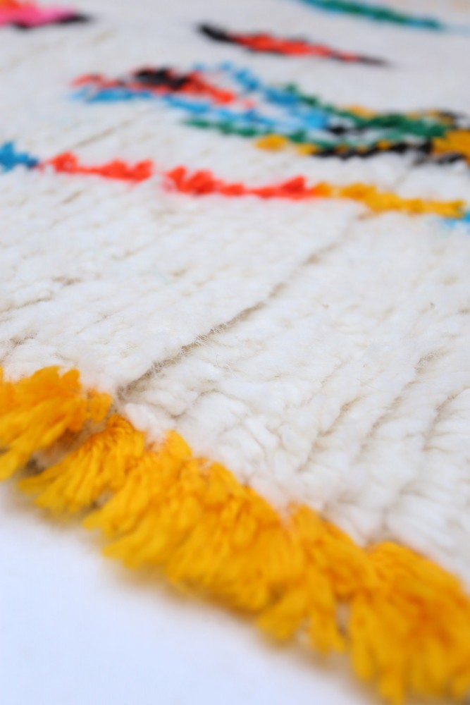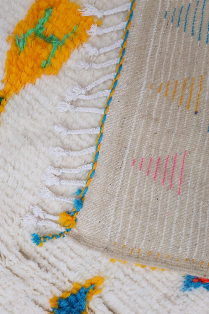 Esta alfombra bereber llamada Azilal recibe su nombre de la región de Azilal en Marruecos, donde ha sido confeccionada a mano en un telar tradicional de madera. Sus diseños representan los estados de ánimo, amores y penas de la tejedora en el momento de su creación. Una vez que se ha creado esta alfombra bereber de colores, ella creará otra totalmente diferente, dependiendo de sus emociones en ese momento. Cada pieza es única.