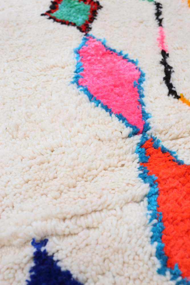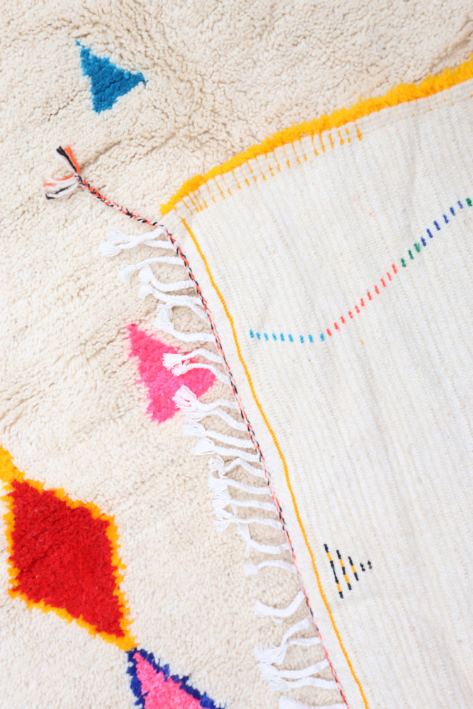 Esta alfombra bereber llamada Azilal recibe su nombre de la región de Azilal en Marruecos, donde ha sido confeccionada a mano en un telar tradicional de madera. Sus diseños representan los estados de ánimo, amores y penas de la tejedora en el momento de su creación. Una vez que se ha creado esta alfombra bereber de colores, ella creará otra totalmente diferente, dependiendo de sus emociones en ese momento. Cada pieza es única.