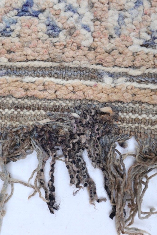 Esta alfombra bereber llamada Azilal recibe su nombre de la región de Azilal en Marruecos, donde ha sido confeccionada a mano en un telar tradicional de madera. Sus diseños representan los estados de ánimo, amores y penas de la tejedora en el momento de su creación. Una vez que se ha creado esta alfombra bereber de colores, ella creará otra totalmente diferente, dependiendo de sus emociones en ese momento. Cada pieza es única.