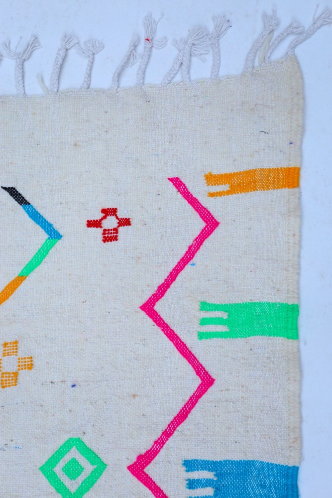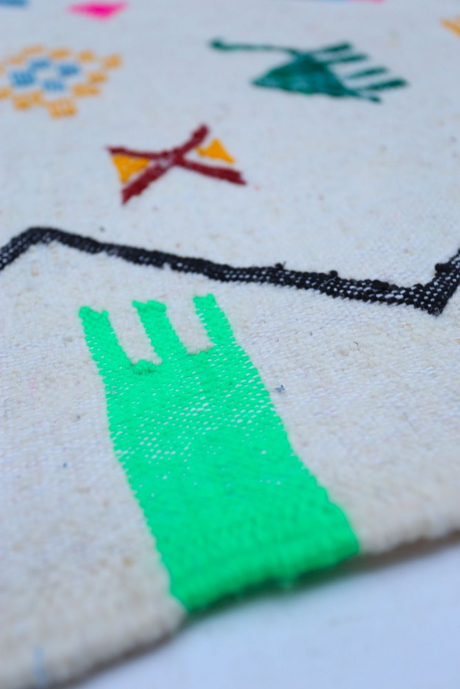 Esta alfombra bereber llamada Azilal recibe su nombre de la región de Azilal en Marruecos, donde ha sido confeccionada a mano en un telar tradicional de madera. Sus diseños representan los sentimientos, amores y penas de la tejedora en el momento de su creación. Una vez que se ha creado esta alfombra bereber colorida, ella creará otra totalmente diferente, según sus emociones del momento. Cada pieza es única.