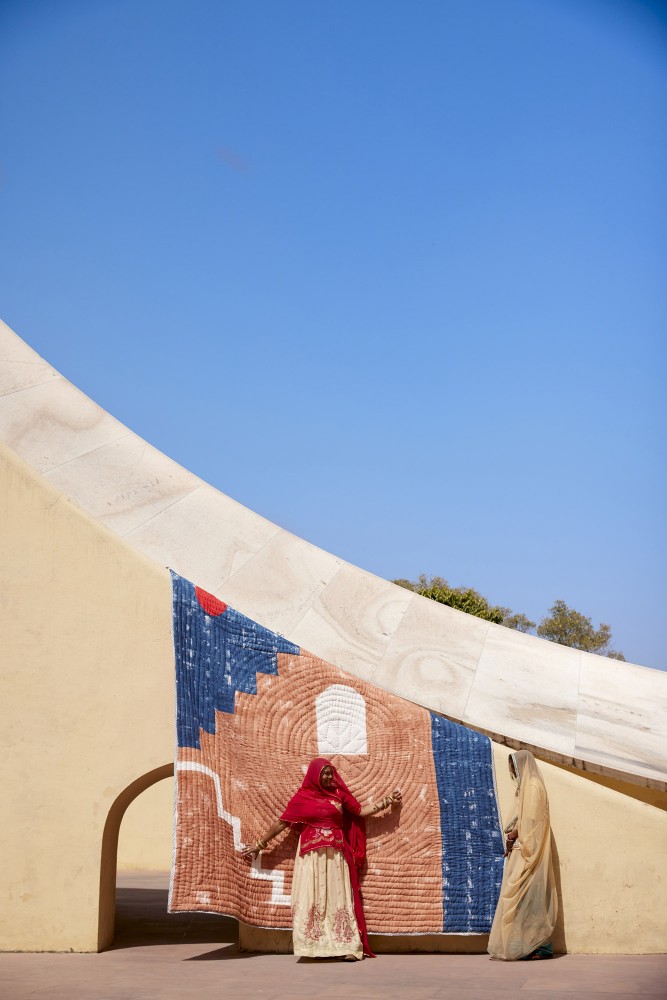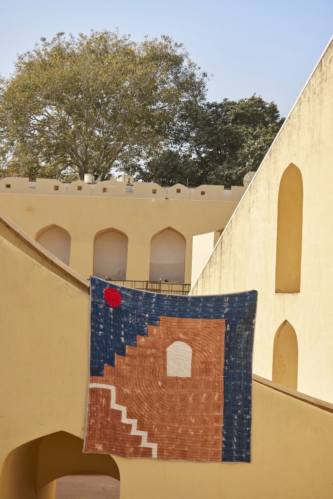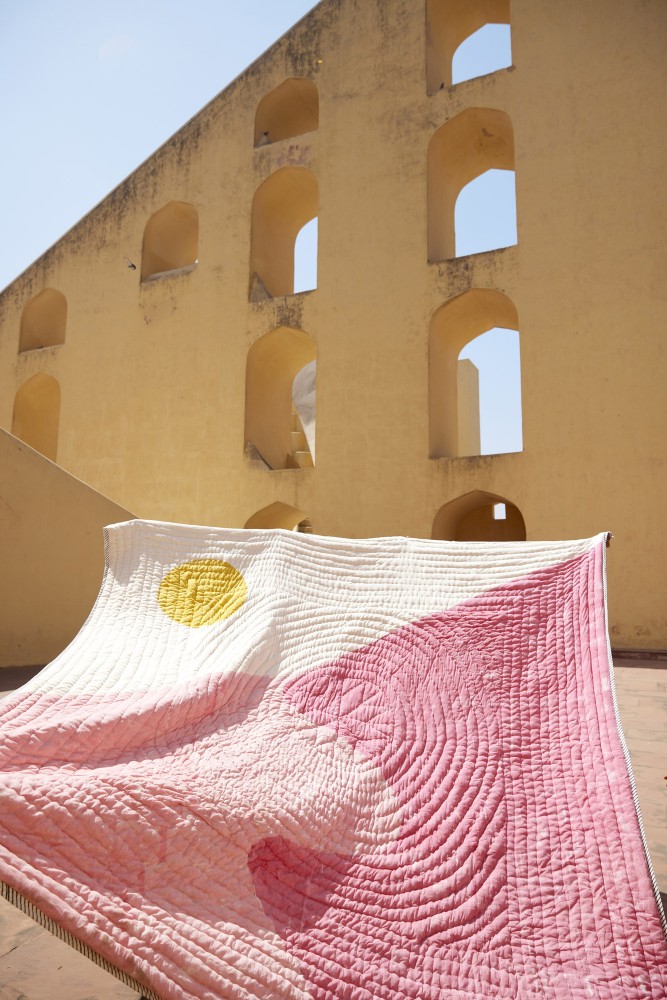 Esta colcha fue diseñada en Los Ángeles y fabricada a mano en la India, requiriendo la intervención de cuatro artesanos: escultores de madera, impresores, costureras y tintoreros. El diseño se imprime utilizando bloques de madera tallados a mano y sumergidos en tintes.