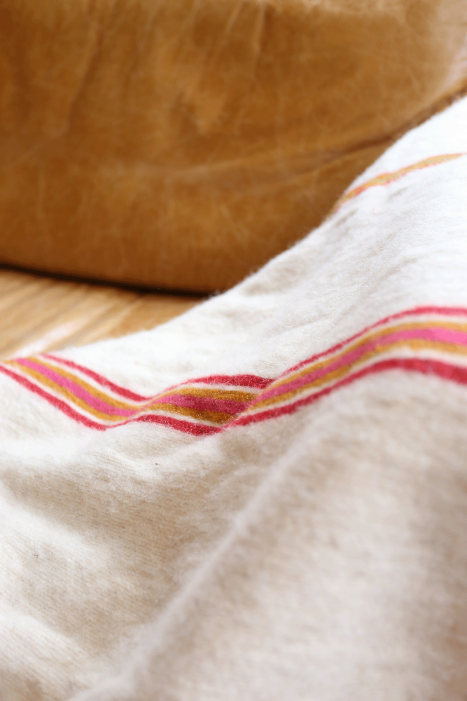Manta bereber con borlas blancas y rayas rosas de lana, confeccionada a mano en Marruecos.