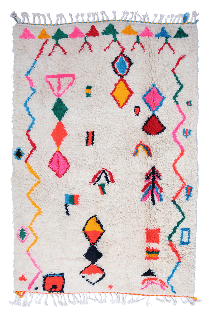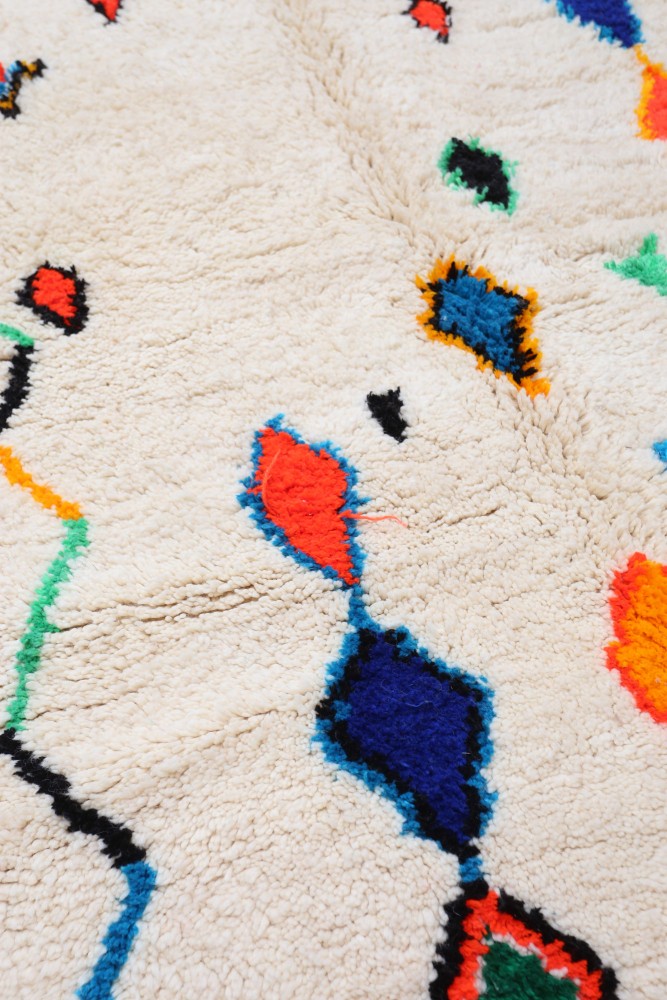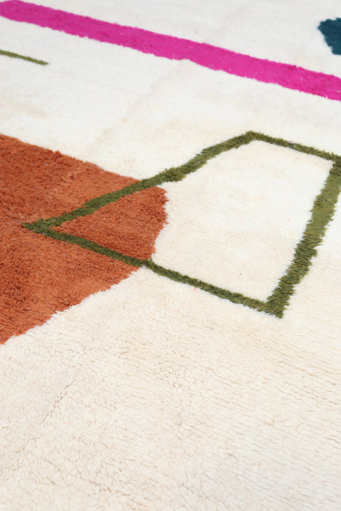 Le tapis Azilal est un tapis berbère composé de laine de moutons élevés dans les montagnes de l’Atlas au Maroc. Les couleurs sont soit en laine, soit en coton. Ses poils font environ 2,5 cm d’épaisseur, ce qui rend ce tapis très confortable dans un intérieur. Tapis carré berbère ou tapis rond berbère : ces tapis se distinguent par leurs dessins et motifs. Ces derniers peuvent posséder une symbolique ou être abstraits. Le dessin du tapis Azilal est libre et géométrique. On retrouve généralement les motifs sur un fond écru, crème ou beige afin d’offrir un contraste naturel et de souligner les graphismes et les couleurs. Avec ce tapis aux couleurs vives, les artisans laissent parler leur créativité avec des tâches, lignes droites, zigzags, diamants et carrés. Les touches de couleur sur un tapis berbère Azilal sont ajoutées avec des bouts de laine ou des fils de coton coloré.