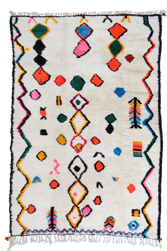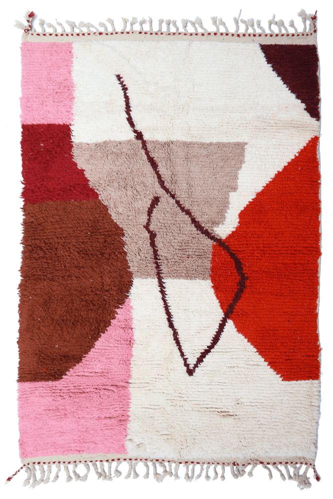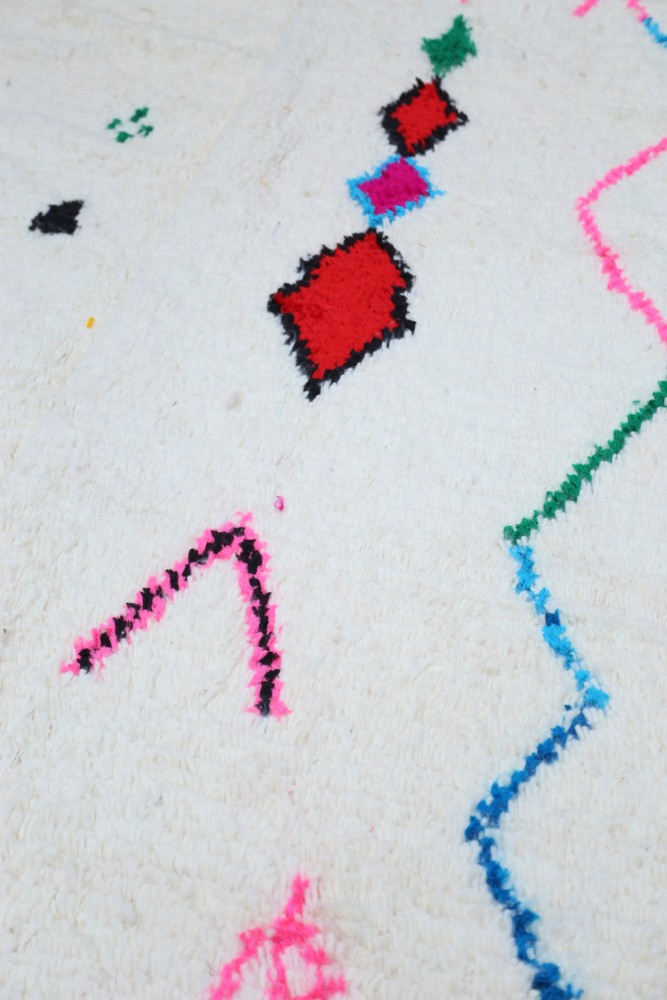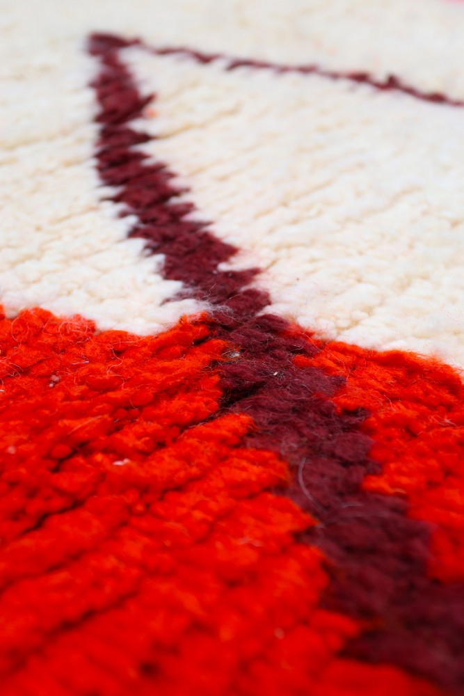 Le tapis Azilal provient d’une tribu de la région rocheuse et haute d’Azilal, qui se trouve dans les montagnes du Haut Atlas. Ce tapis berbère rouge possède de nombreux motifs abstraits avec plusieurs symboles berbères. Ce tapis avec poils longs ou avec poils courts met en avant la couleur, souvent sur fond beige, blanc ou écru. Vous pouvez trouver des modèles qui valorisent la couleur rouge avec des motifs géométriques symbolisant la fertilité, la protection, la nature, la chance ou le foyer (les motifs seront principalement des losanges, on retrouve moins de tapis berbère à pois pour la tribu Azilal). Ces modèles de tapis marocains sont souvent associés à des tapis berbères fluos de par leur mélange de couleurs vives et chatoyantes.