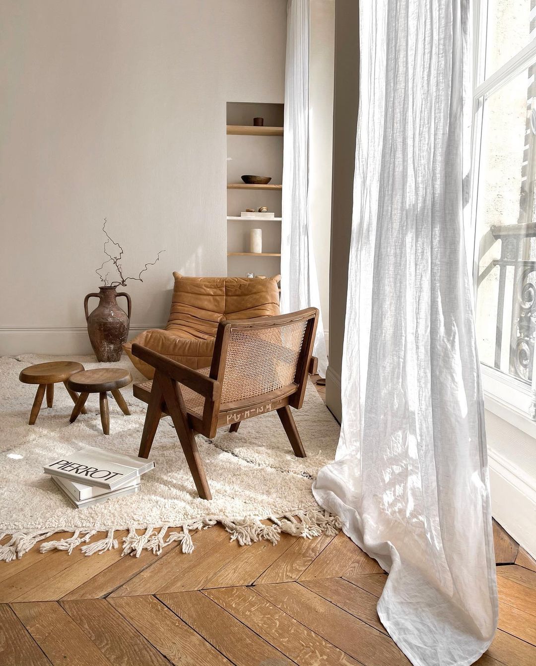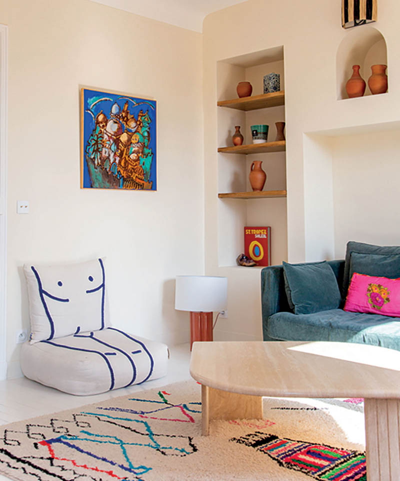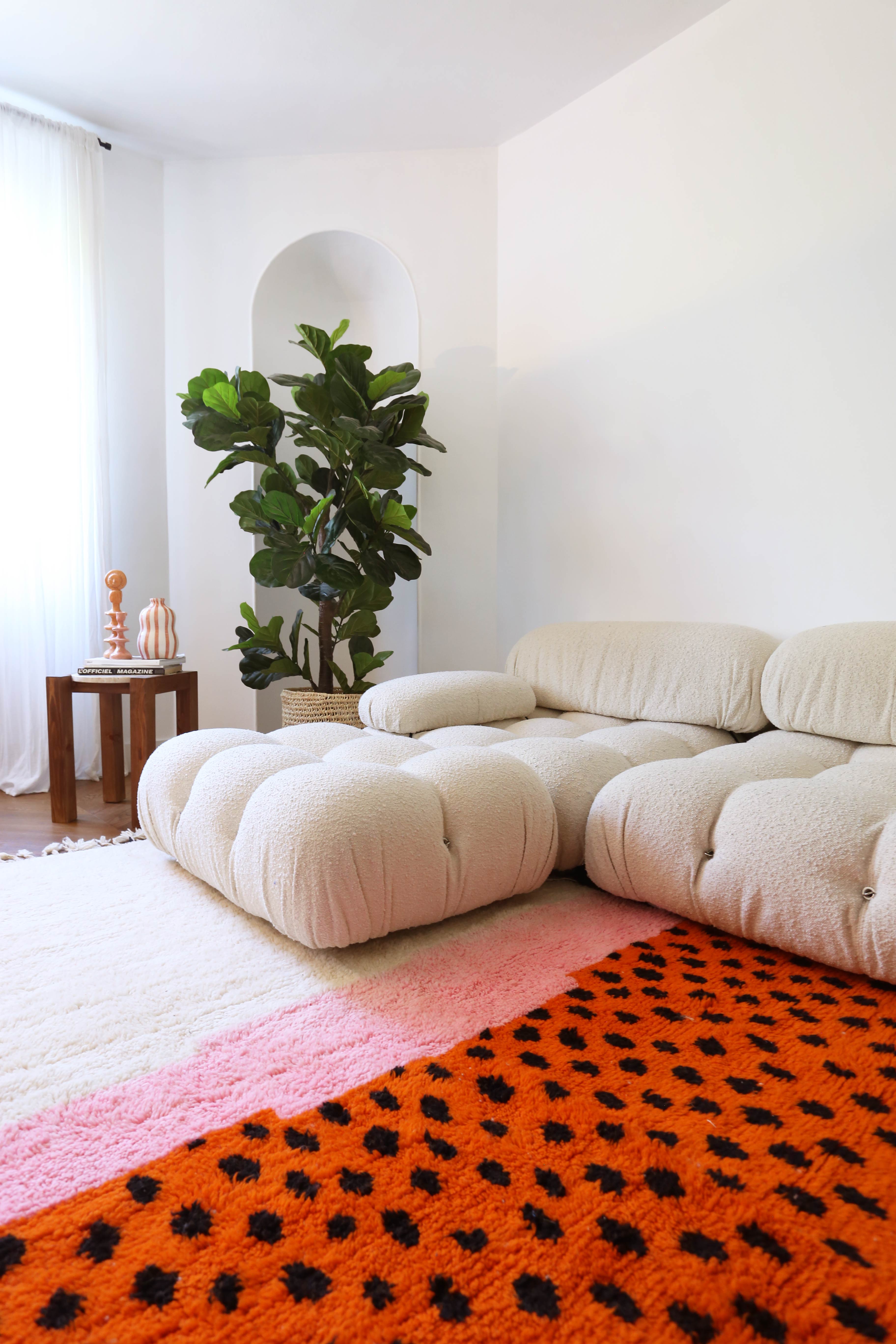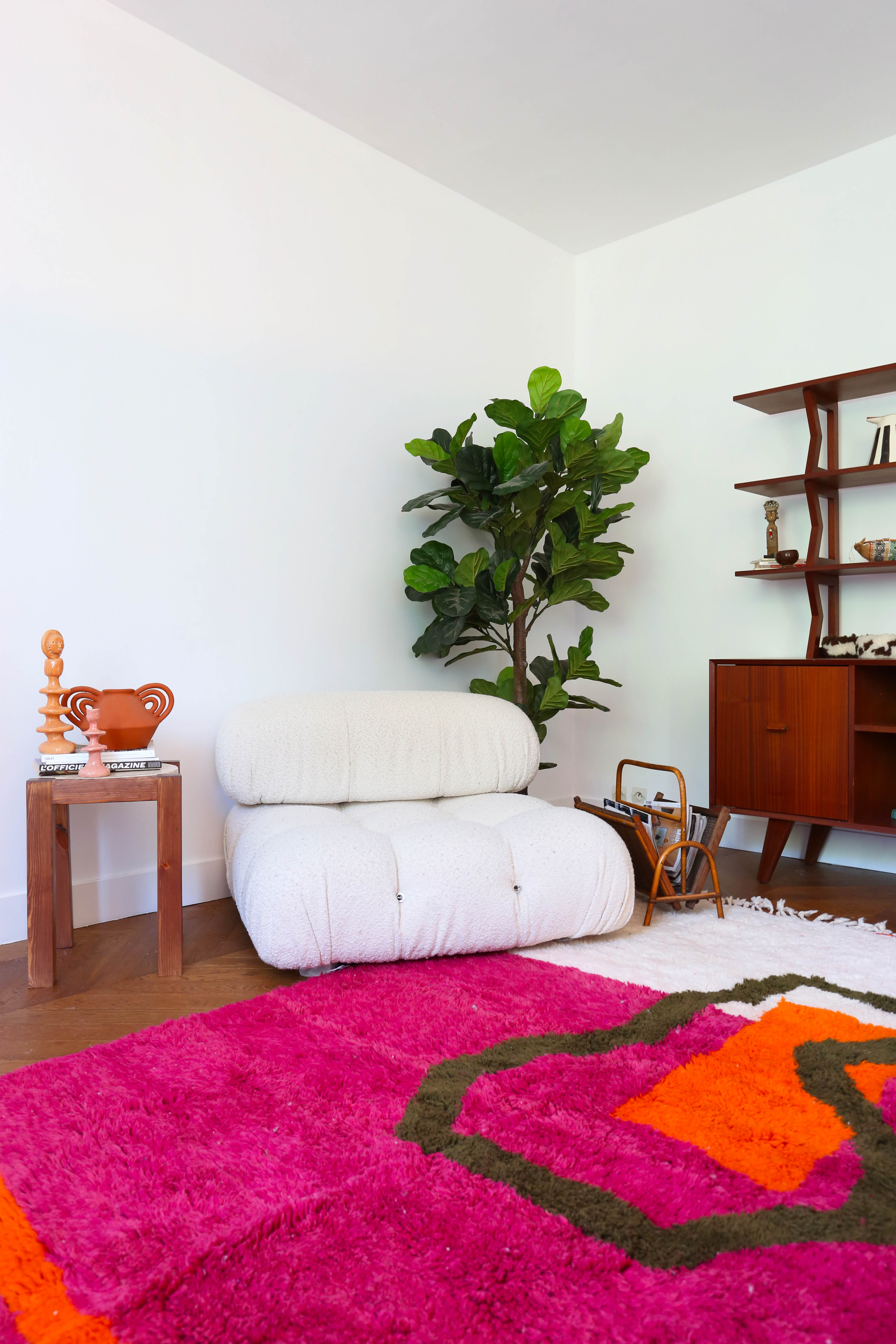 habillée de l'un de nos tapis Azilal aux motifs graphiques et modernes. Tout est si joli !