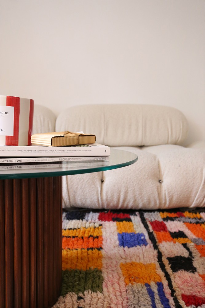 Table basse en verre et bois de sapin rouge designée par Marion la fondatrice de THEM et confectionnée de façon 100% artisanale au Maroc dans l’un de nos talentueux ateliers partenaires.