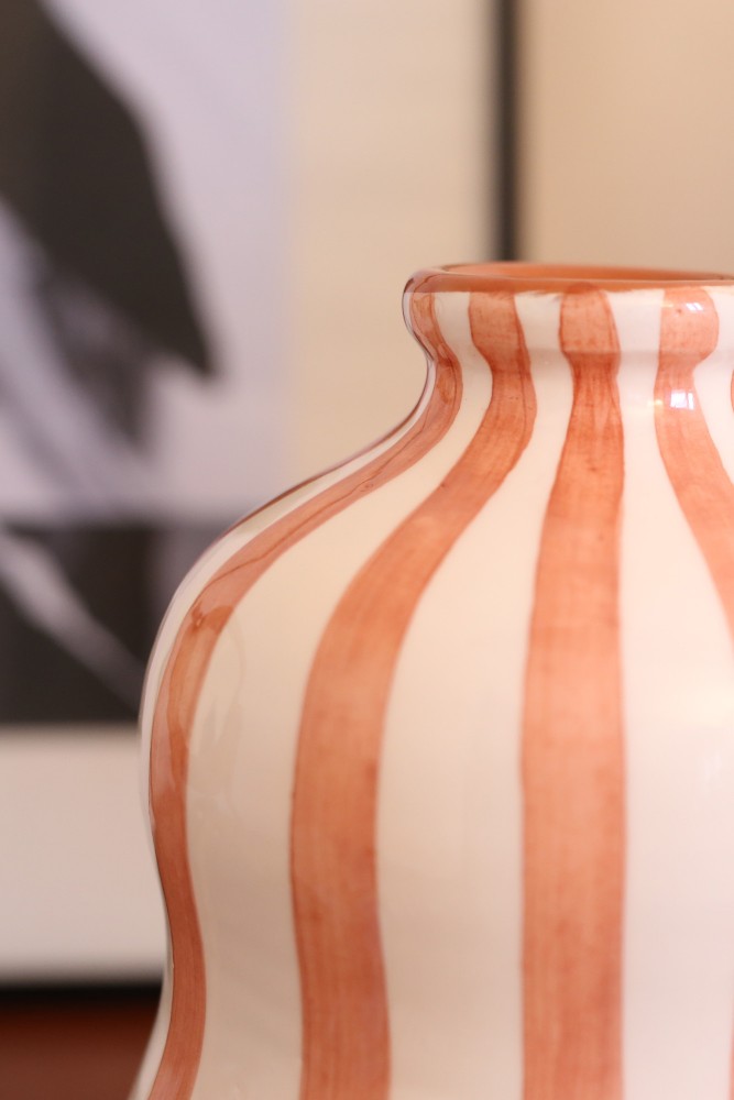 Vase arrondi à rayures en blanc et rose en céramique fabriqué de façon artisanale au Portugal
