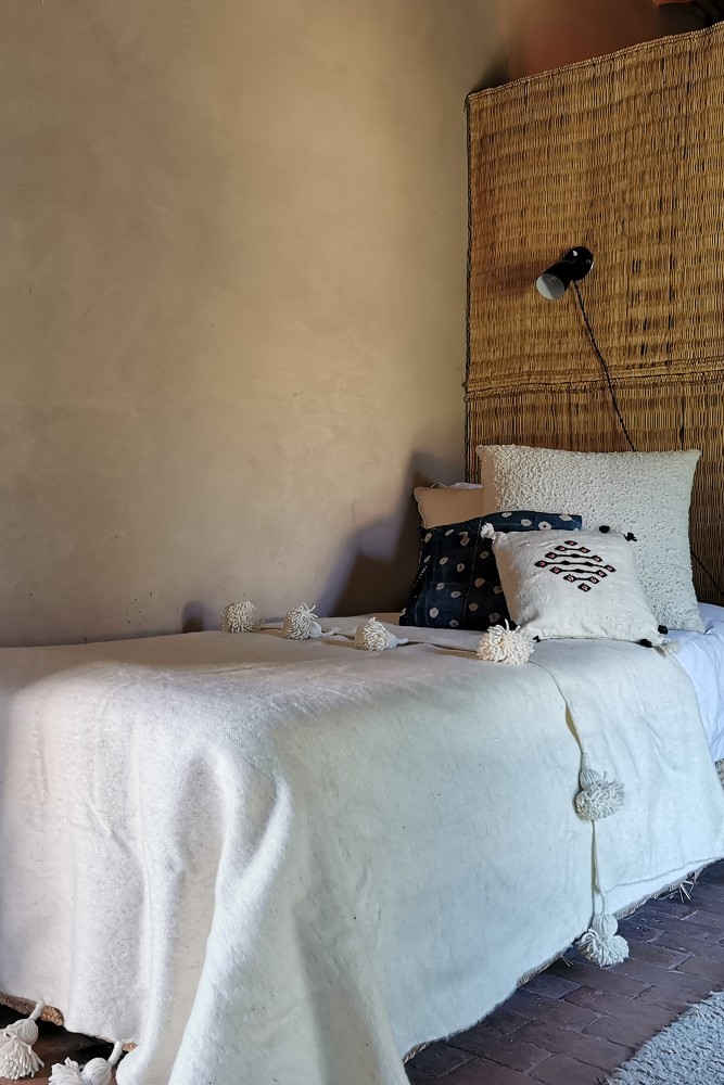 Plaid en laine confectionné à la main sur un métier à tisser traditionnel au Maroc. Il peut être utilisé en plaid sur un canapé ou un fauteuil, ou encore en dessus-de-lit.