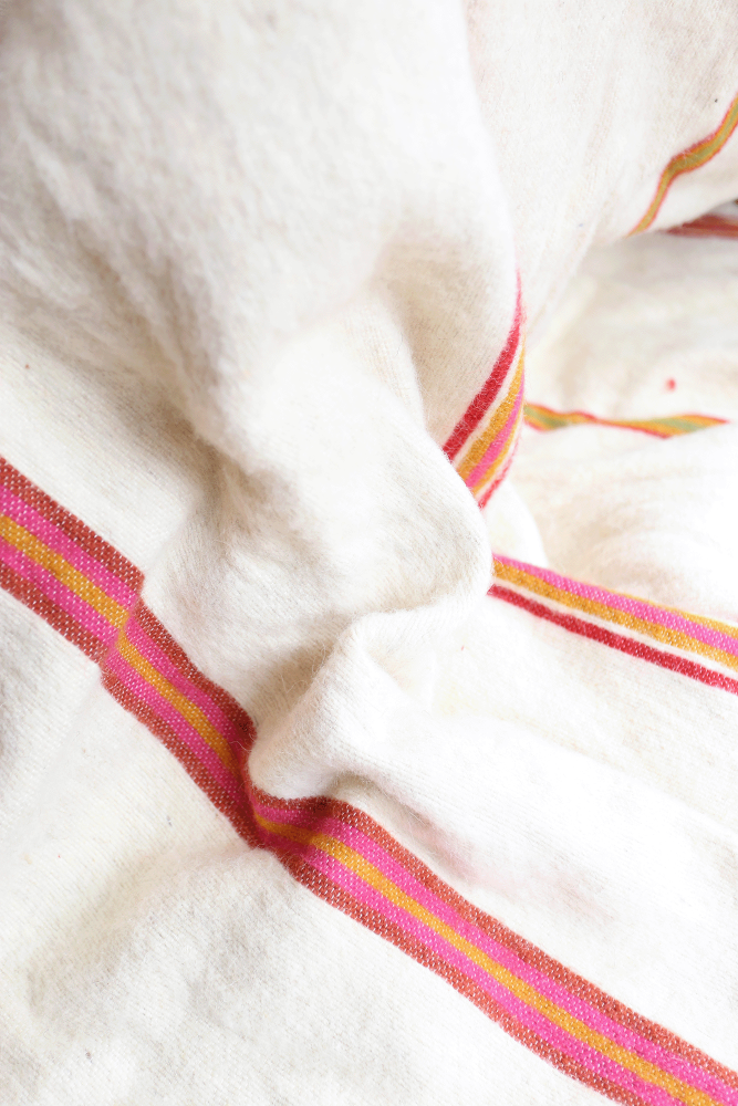 Plaid berbère pompon blanc et rayures roses en laine confectionné à la main au Maroc
