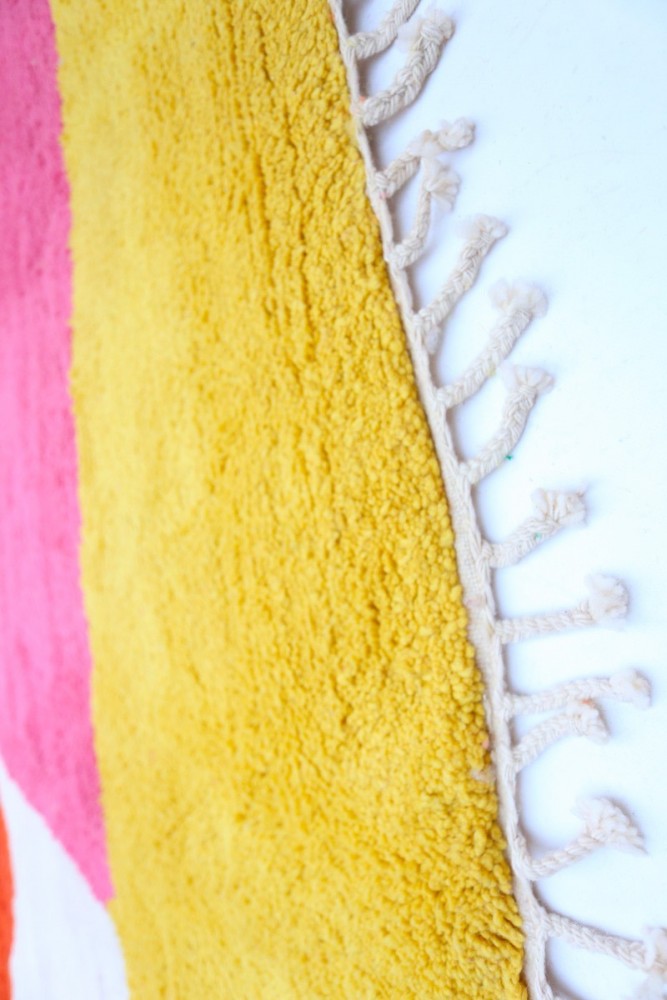 Ce tapis berbère que l'on appelle Azilal tient son nom de la région d'Azilal au Maroc où il a été confectionné à la main sur un métier à tisser traditionnel en bois. Ses motifs représentent les humeurs, les amours, les peines de la tisseuse au moment de sa création. Une fois ce tapis berbère coloré créé, elle en confectionnera un autre totalement différent, en fonction de ses émotions du moment. Chaque pièce est donc unique.