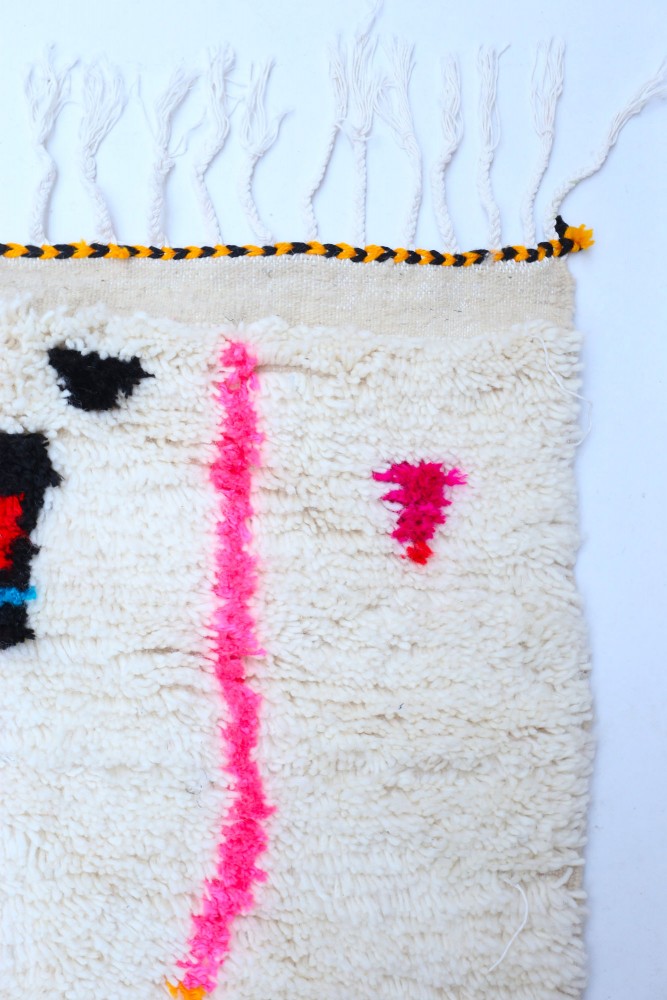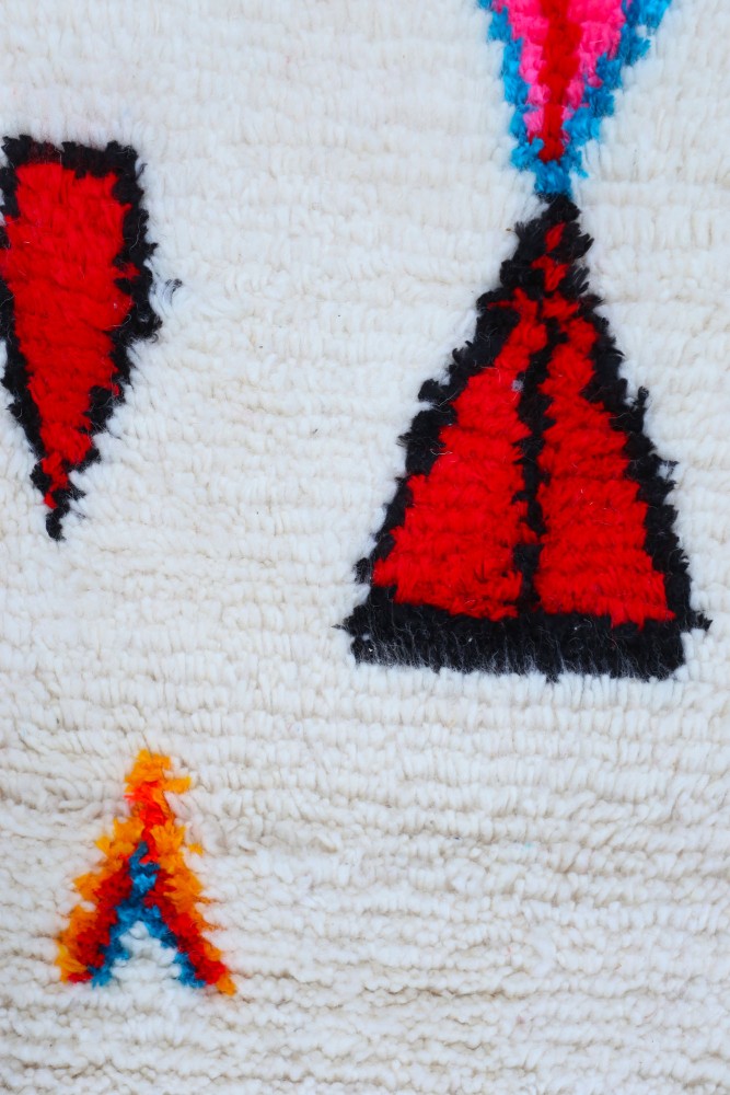 Ce tapis berbère que l'on appelle Azilal tient son nom de la région d'Azilal au Maroc où il a été confectionné à la main sur un métier à tisser traditionnel en bois. Ses motifs représentent les humeurs, les amours, les peines de la tisseuse au moment de sa création. Une fois ce tapis berbère coloré créé, elle en confectionnera un autre totalement différent, en fonction de ses émotions du moment. Chaque pièce est donc unique.
