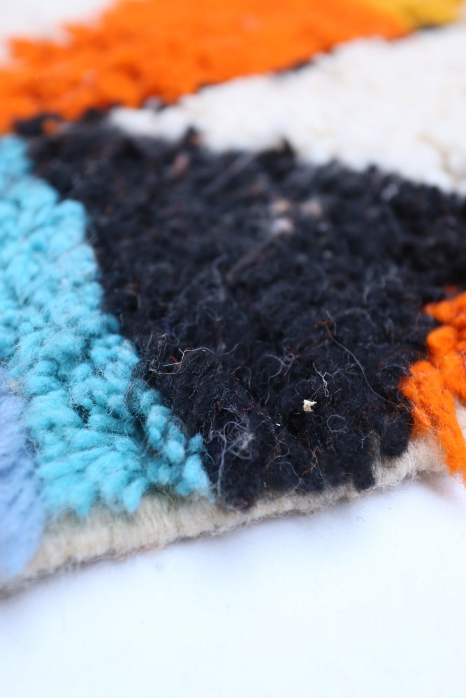 Ce tapis berbère que l'on appelle Azilal tient son nom de la région d'Azilal au Maroc où il a été confectionné à la main sur un métier à tisser traditionnel en bois. Ses motifs représentent les humeurs, les amours, les peines de la tisseuse au moment de sa création. Une fois ce tapis berbère coloré créé, elle en confectionnera un autre totalement différent, en fonction de ses émotions du moment. Chaque pièce est donc unique.