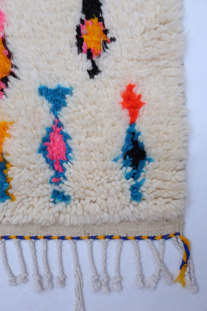 Ce tapis berbère que l'on appelle Azilal tient son nom de la région d'Azilal au Maroc où il a été confectionné à la main sur un métier à tisser traditionnel en bois. Ses motifs représentent les humeurs, les amours, les peines de la tisseuse au moment de sa création. Une fois ce tapis berbère coloré créé, elle en confectionnera un autre totalement différent, en fonction de ses émotions du moment. Chaque pièce est donc unique.