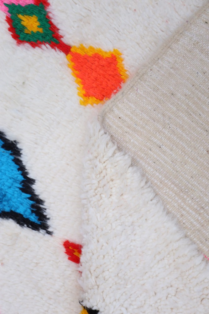 Ce tapis berbère que l'on appelle Azilal tient son nom de la région d'Azilal au Maroc où il a été confectionné à la main sur un métier à tisser traditionnel en bois. Ses motifs représentent les humeurs, les amours, les peines de la tisseuse au moment de sa création. Une fois ce tapis berbère coloré créé, elle en confectionnera un autre totalement différent, en fonction de ses émotions du moment. Chaque pièce est donc unique.