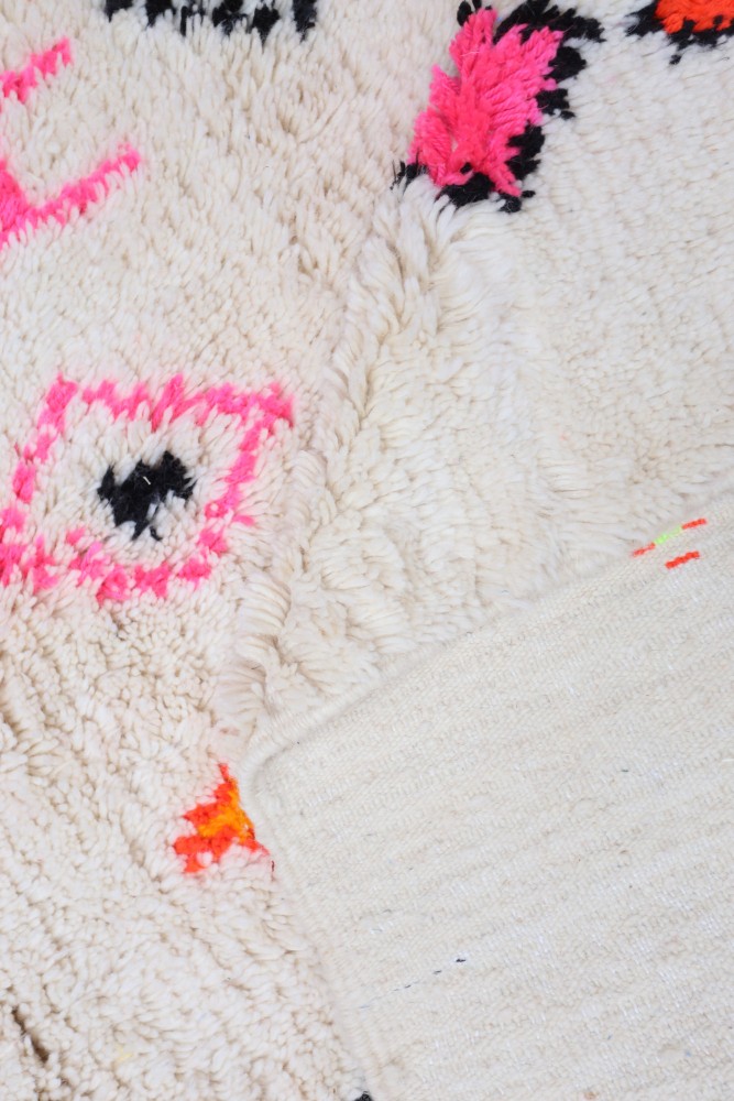 Ce tapis berbère que l'on appelle Azilal tient son nom de la région d'Azilal au Maroc où il a été confectionné à la main sur un métier à tisser traditionnel en bois. Ses motifs représentent les humeurs, les amours, les peines de la tisseuse au moment de sa création. Une fois ce tapis berbère coloré créé, elle en confectionnera un autre totalement différent, en fonction de ses émotions du moment. Chaque pièce est donc unique.