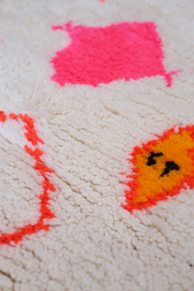 Nos tapis avec un fond blanc et des dessins colorés sont toujours avec un fond blanc en laine. Les couleurs peuvent être soit en coton soit en laine. Les couleurs très vives sont généralement en coton et les couleurs qui ont un rendu plus naturel sont elles en laine. Nos tapis qui sont tout colorés sont eux 100% en laine.