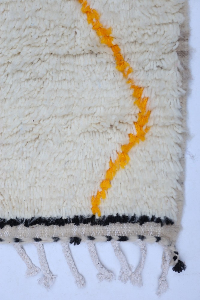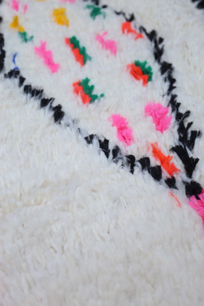 Ce tapis berbère que l'on appelle Azilal tient son nom de la région d'Azilal au Maroc où il a été confectionné à la main sur un métier à tisser traditionnel en bois. Ses motifs représentent les humeurs, les amours, les peines de la tisseuse au moment de sa création. Une fois ce tapis berbère coloré créé, elle en confectionnera un autre totalement différent, en fonction de ses émotions du moment. Chaque pièce est donc unique.