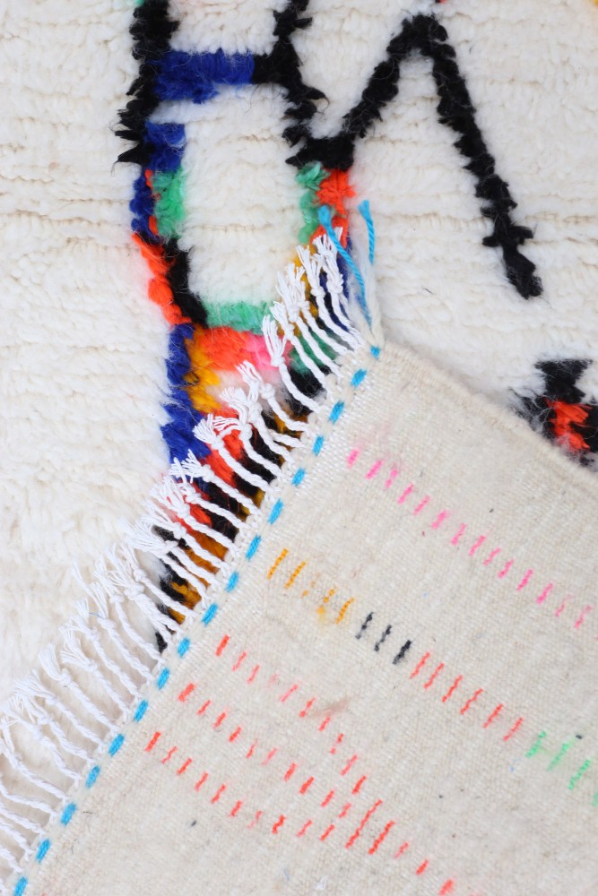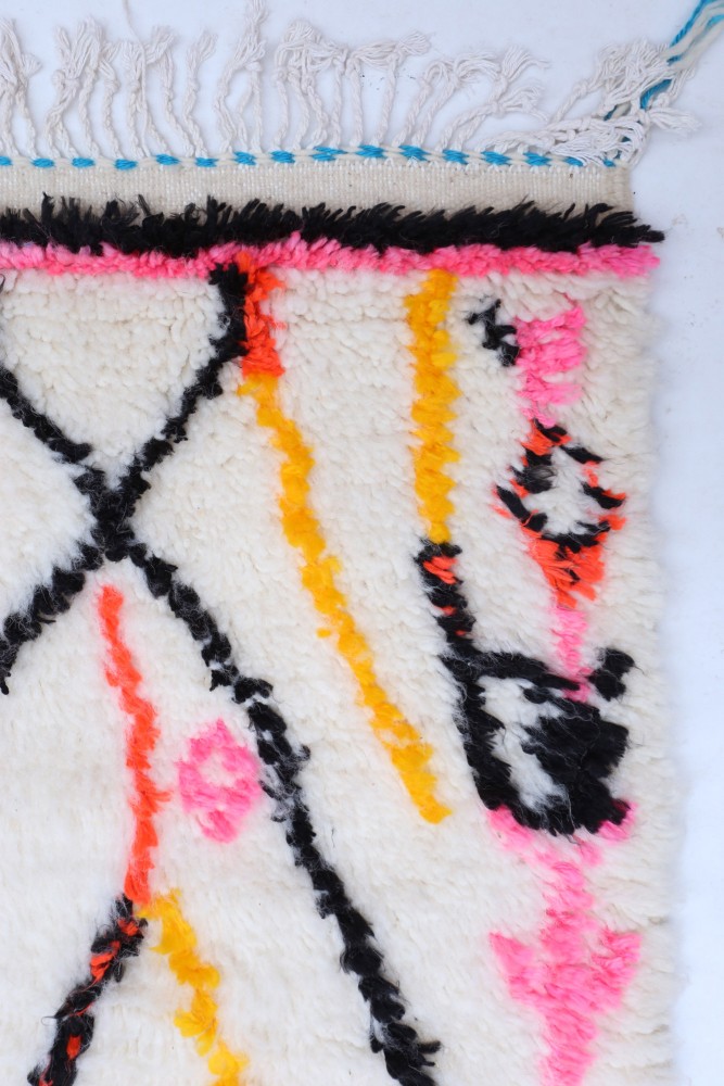 Ce tapis berbère que l'on appelle Azilal tient son nom de la région d'Azilal au Maroc où il a été confectionné à la main sur un métier à tisser traditionnel en bois. Ses motifs représentent les humeurs, les amours, les peines de la tisseuse au moment de sa création. Une fois ce tapis berbère coloré créé, elle en confectionnera un autre totalement différent, en fonction de ses émotions du moment. Chaque pièce est donc unique.