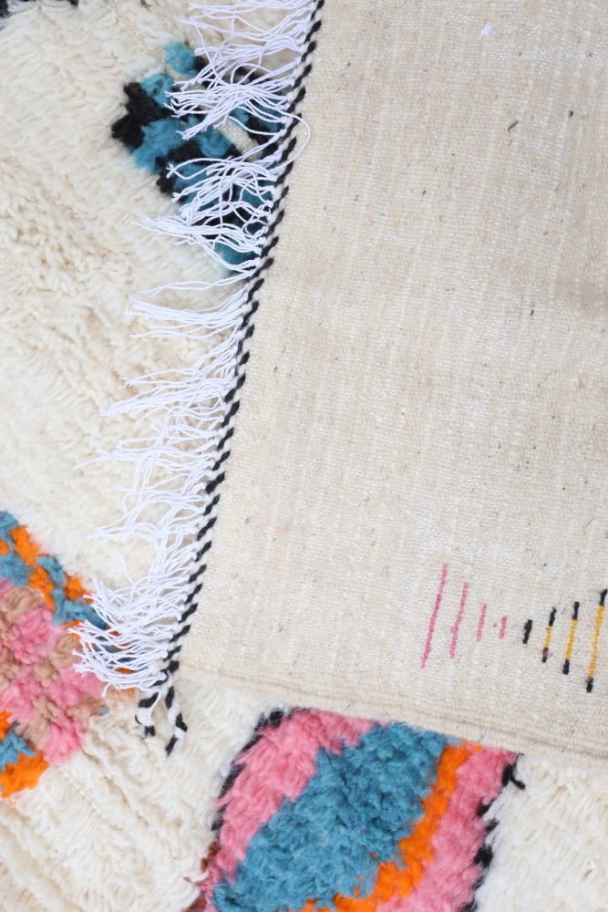 Ce tapis berbère que l'on appelle Azilal tient son nom de la région d'Azilal au Maroc où il a été confectionné à la main sur un métier à tisser traditionnel en bois. Ses motifs représentent les humeurs, les amours, les peines de la tisseuse au moment de sa création. Une fois ce tapis berbère coloré créé, elle en confectionnera un autre totalement différent, en fonction de ses émotions du moment. Chaque pièce est donc unique.