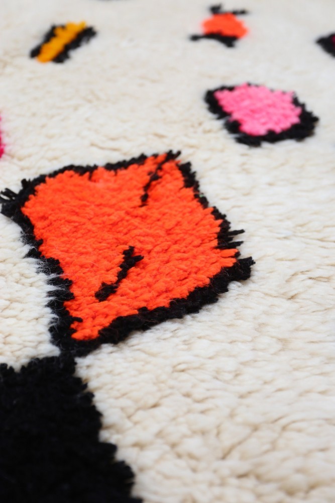 Ce tapis berbère que l'on appelle Azilal tient son nom de la région d'Azilal au Maroc où il a été confectionné à la main sur un métier à tisser traditionnel en bois. Ses motifs représentent les humeurs, les amours, les peines de la tisseuse au moment de sa création. Une fois ce tapis berbère coloré créé, elle en confectionnera un autre totalement différent, en fonction de ses émotions du moment. Chaque pièce est donc unique.