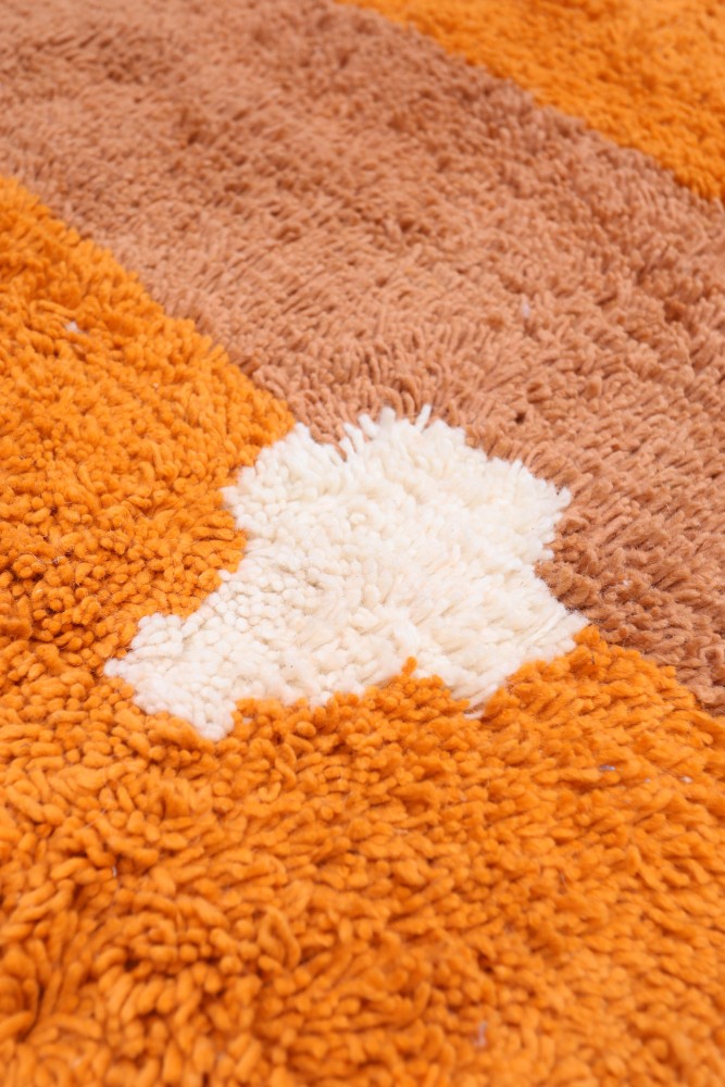 Ce tapis berbère que l'on appelle Azilal tient son nom de la région d'Azilal au Maroc où il a été confectionné à la main sur un métier à tisser traditionnel en bois. Ses motifs représentent les humeurs, les amours, les peines de la tisseuse au moment de sa création. Une fois ce tapis berbère coloré créé, elle en confectionnera un autre totalement différent, en fonction de ses émotions du moment. Chaque pièce est donc unique.