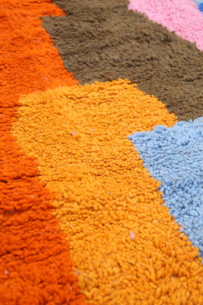 Ce tapis berbère que l'on appelle Azilal tient son nom de la région d'Azilal au Maroc où il a été confectionné à la main sur un métier à tisser traditionnel en bois. Ses motifs représentent les humeurs, les amours, les peines de la tisseuse au moment de sa création. Une fois ce tapis berbère coloré créé, elle en confectionnera un autre totalement différent, en fonction de ses émotions du moment. Chaque pièce est donc unique.