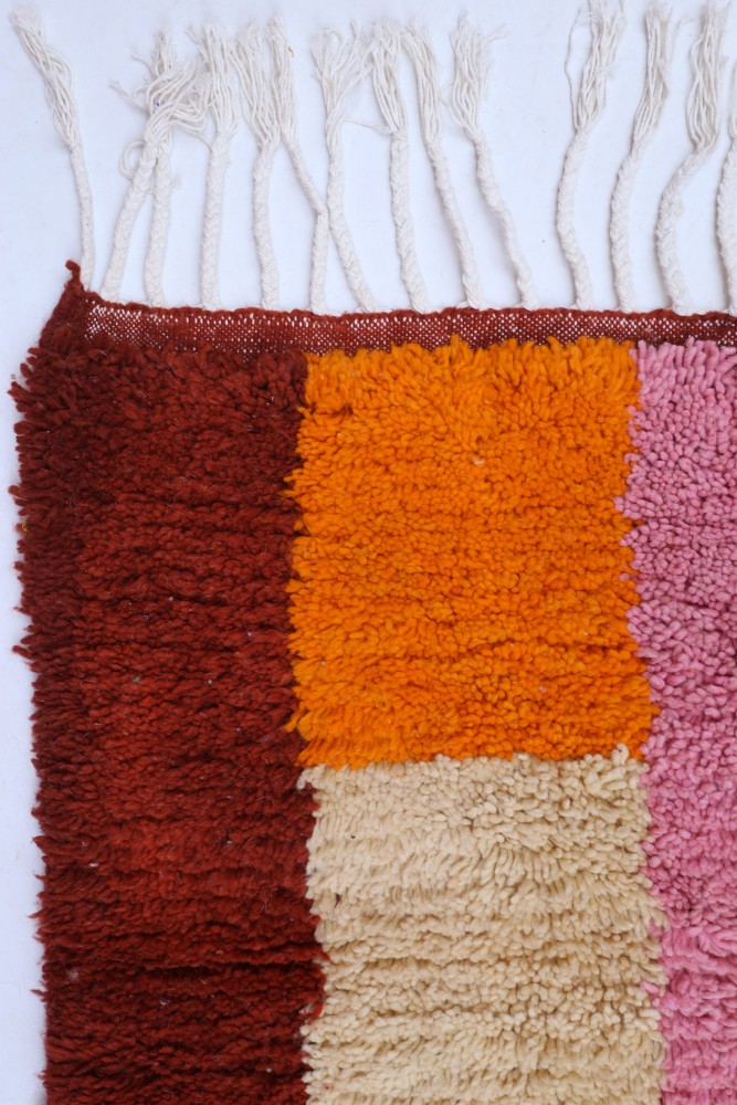 Ce tapis berbère que l'on appelle Azilal tient son nom de la région d'Azilal au Maroc où il a été confectionné à la main sur un métier à tisser traditionnel en bois. Ses motifs représentent les humeurs, les amours, les peines de la tisseuse au moment de sa création. Une fois ce tapis berbère coloré créé, elle en confectionnera un autre totalement différent, en fonction de ses émotions du moment. Chaque pièce est donc unique.
