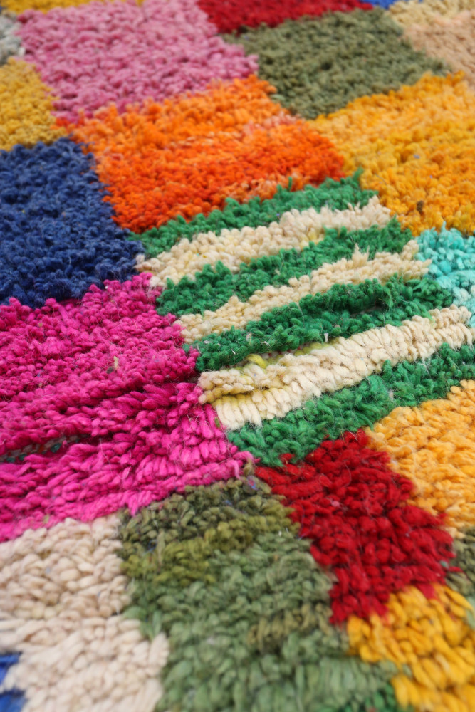 Ce tapis berbère que l'on appelle Azilal tient son nom de la région d'Azilal au Maroc où il a été confectionné à la main sur un métier à tisser traditionnel en bois. Ses motifs représentent les humeurs, les amours, les peines de la tisseuse au moment de sa création. Une fois ce tapis berbère coloré créé, elle en confectionnera un autre totalement différent, en fonction de ses émotions du moment. Chaque pièce est donc unique.