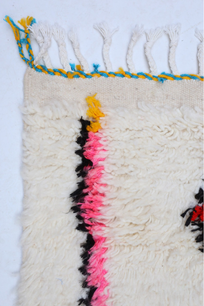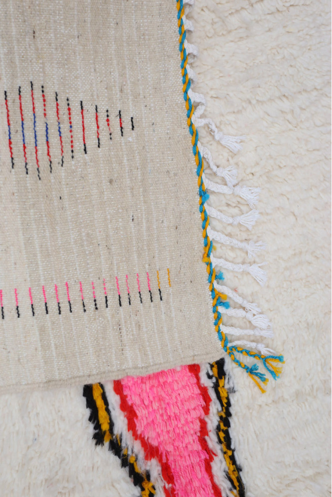 Ce tapis berbère que l'on appelle Azilal tient son nom de la région d'Azilal au Maroc où il a été confectionné à la main sur un métier à tisser traditionnel en bois. Ses motifs représentent les humeurs, les amours, les peines de la tisseuse au moment de sa création. Une fois ce tapis berbère coloré créé, elle en confectionnera un autre totalement différent, en fonction de ses émotions du moment. Chaque pièce est donc unique.