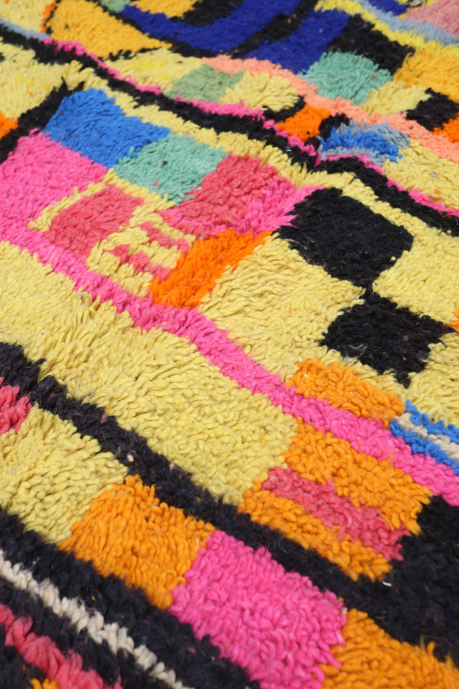 Ce tapis berbère que l'on appelle Azilal tient son nom de la région d'Azilal au Maroc où il a été confectionné à la main sur un métier à tisser traditionnel en bois. Ses motifs représentent les humeurs, les amours, les peines de la tisseuse au moment de sa création. Une fois ce tapis berbère coloré créé, elle en confectionnera un autre totalement différent, en fonction de ses émotions du moment. Chaque pièce est donc unique.