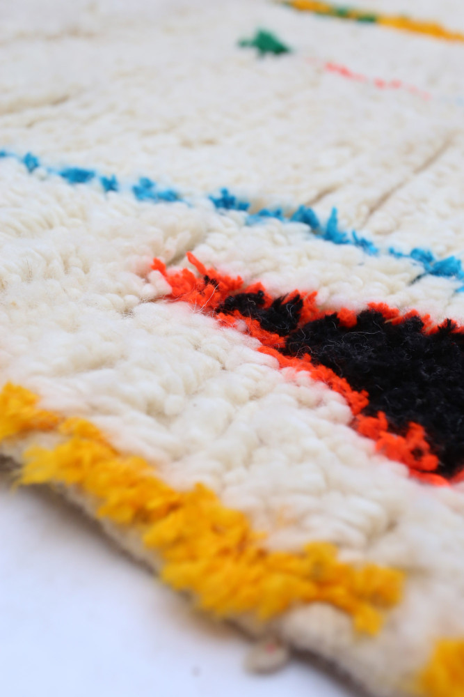 Ce tapis berbère que l'on appelle Azilal tient son nom de la région d'Azilal au Maroc où il a été confectionné à la main sur un métier à tisser traditionnel en bois. Ses motifs représentent les humeurs, les amours, les peines de la tisseuse au moment de sa création. Une fois ce tapis berbère coloré créé, elle en confectionnera un autre totalement différent, en fonction de ses émotions du moment. Chaque pièce est donc unique.