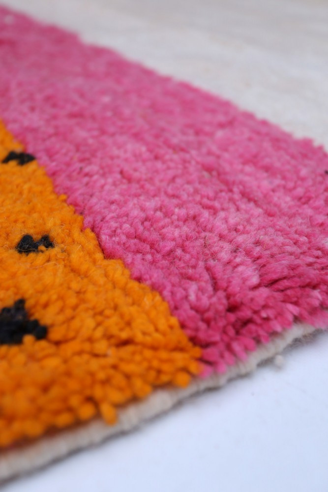 Ce tapis berbère que l'on appelle Azilal tient son nom de la région d'Azilal au Maroc où il a été confectionné à la main sur un métier à tisser traditionnel en bois. Ses motifs représentent les humeurs, les amours, les peines de la tisseuse au moment de sa création. Une fois ce tapis berbère coloré créé, elle en confectionnera un autre totalement différent, en fonction de ses émotions du moment. Chaque pièce est donc unique.