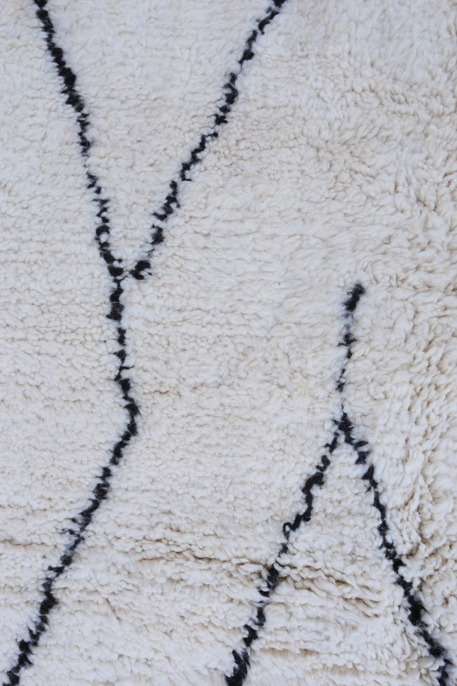 Nos tapis avec un fond blanc et des dessins colorés sont toujours avec un fond blanc en laine. Les couleurs peuvent être soit en coton soit en laine. Les couleurs très vives sont généralement en coton et les couleurs qui ont un rendu plus naturel sont elles en laine. Nos tapis qui sont tout colorés sont eux 100% en laine.