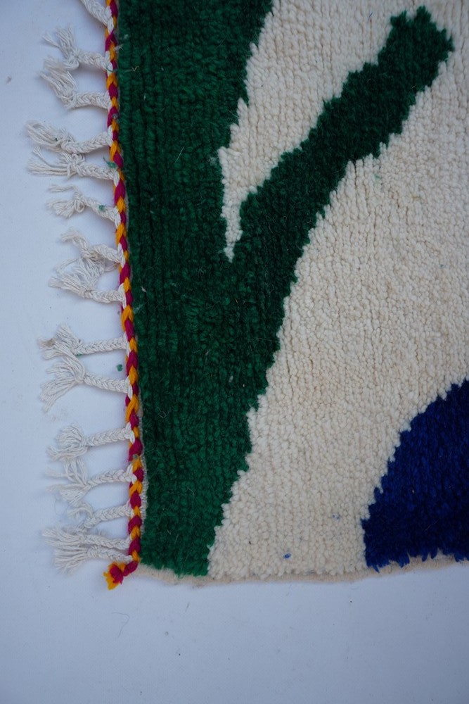 Nos tapis avec un fond blanc et des dessins colorés sont toujours avec un fond blanc en laine. Les couleurs peuvent être soit en coton soit en laine. Les couleurs très vives sont généralement en coton et les couleurs qui ont un rendu plus naturel sont elles en laine. Nos tapis qui sont tout colorés sont eux 100% en laine.