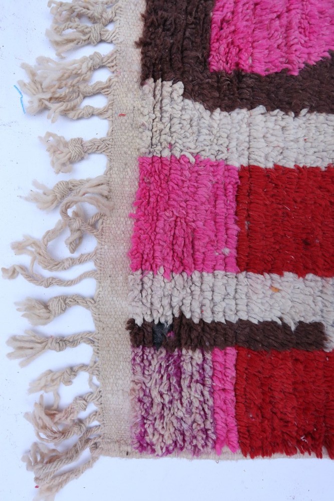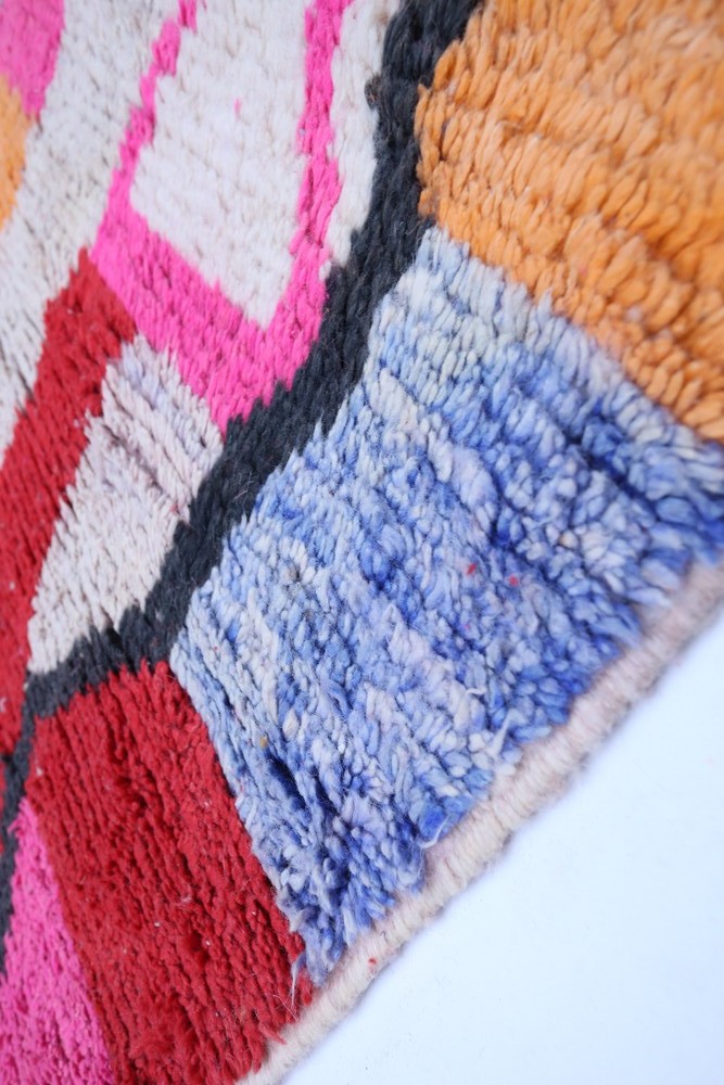 Ce tapis berbère que l'on appelle Boujad tient son nom de la région de Boujad au Maroc où il a été confectionné à la main sur un métier à tisser traditionnel en bois. Ses motifs représentent les humeurs, les amours, les peines de la tisseuse au moment de sa création. Ils sont reconnaissables par leurs couleurs patinés par le soleil et ceux sont des pièces qui apportent beaucoup de caractère à un intérieur.