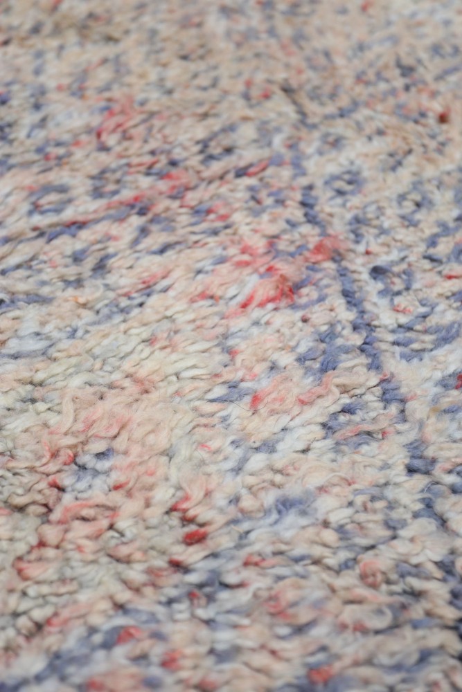 Ce tapis berbère que l'on appelle Boujad tient son nom de la région de Boujad au Maroc où il a été confectionné à la main sur un métier à tisser traditionnel en bois. Ses motifs représentent les humeurs, les amours, les peines de la tisseuse au moment de sa création. Ils sont reconnaissables par leurs couleurs patinés par le soleil et ceux sont des pièces qui apportent beaucoup de caractère à un intérieur.